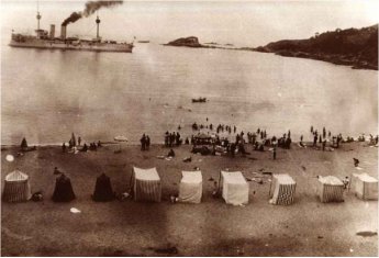 El barco Prat (Crucero) bajo la atenta mirada de los veraneantes de la época, a principios de 1930 en la playa de Zapallar.